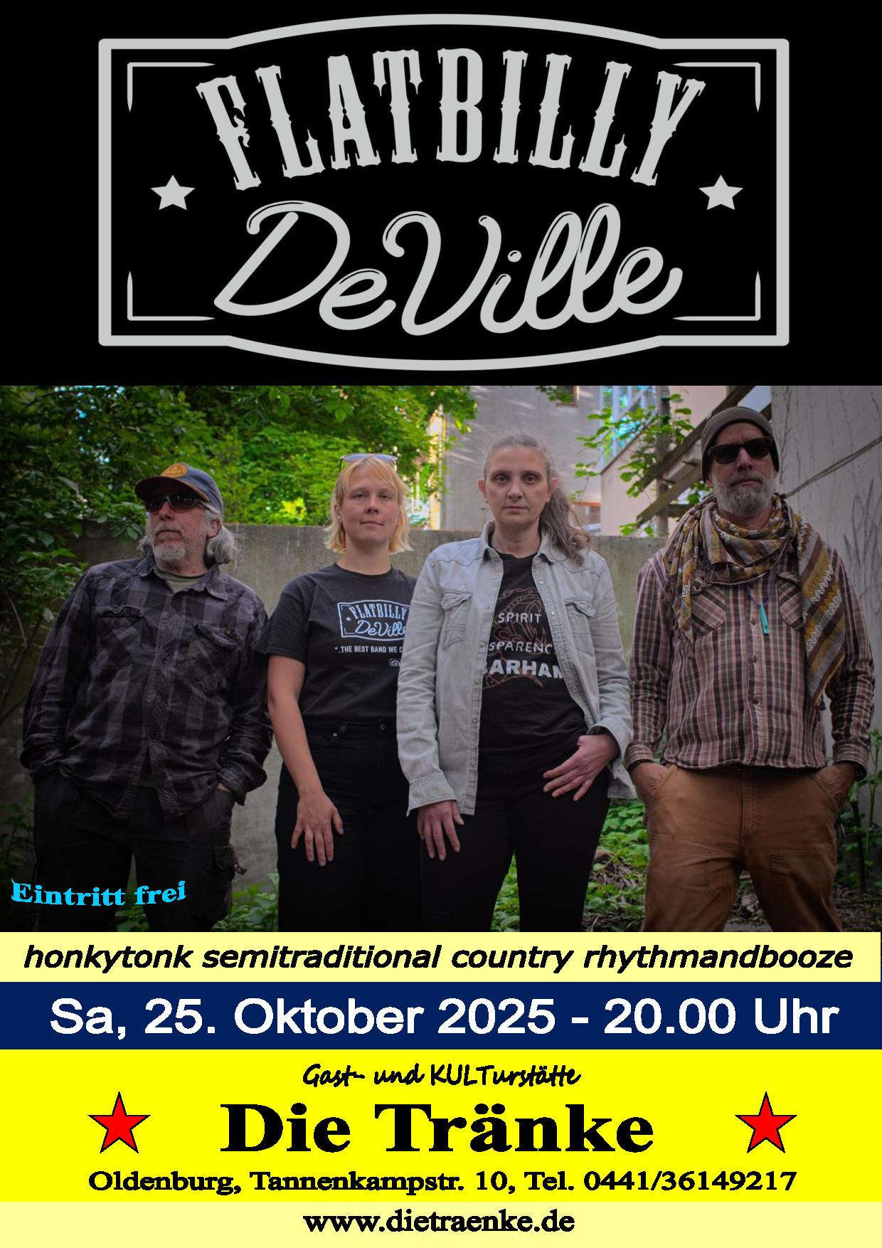Ein Typ aus Bakersfield, California, trifft 2 Deerns und nen Jung aus Bremen, um Musik zu machen. Der Mann aus Bakersfield bringt die nötigen Gene für Country-Music mit und die Bremer kommen ja schließlich auch vom Dorf. Flatbilly DeVille spielen amerikanische Traditionals und Eigenkompositionen aus dem Niemandsland zwischen norddeutschem Feldweg und den Apalachen. Es erwartet euch der honkytonksemitraditionalcountryrhythmandbooze.