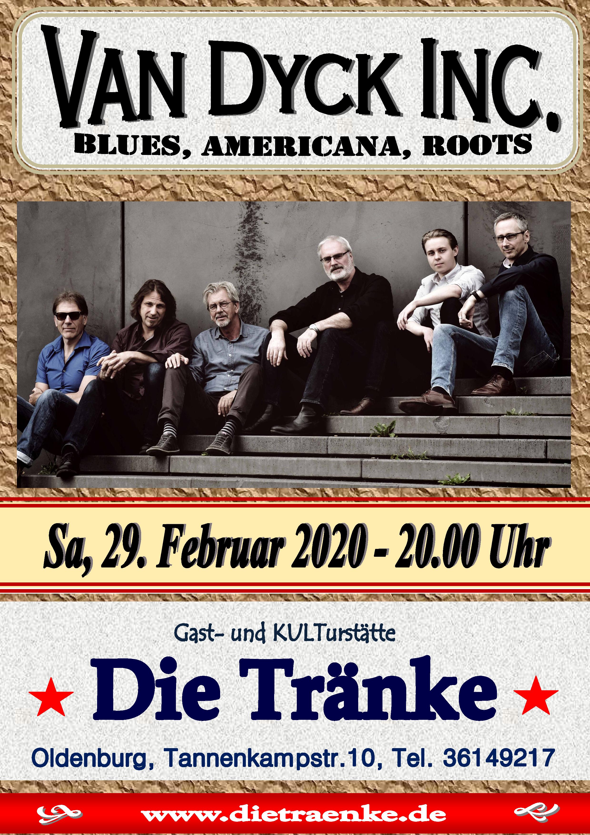 Live ist den Musikern von VAN DYCK INC. die enge Bindung zu ihrer Musik und das blinde Verständnis untereinander anzumerken. Eigenkompositionen und Bearbeitungen ihrer Lieblingssongs, etwa von Van Morrison, Ry Cooder, John Hiatt und Little Feat, werden mit einem Sound präsentiert, wie man ihn von deutschen Bands selten zu hören bekommt. Dabei braucht VAN DYCK INC. keine ausgefeilte Bühnenshow und Lichteffekte, um das Publikum mitzureißen.